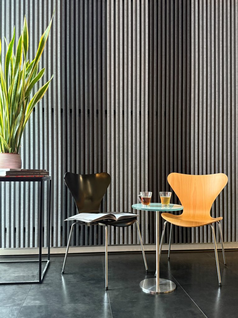 Offering a sleek, linear aesthetic that balances visual impact with acoustic performance, the Groove Wall is made from 20mm-wide thermoformed felt panels that give the impression of slim vertical slats. Their unique W-shape provides strength and rigidity without the need for additional support materials.