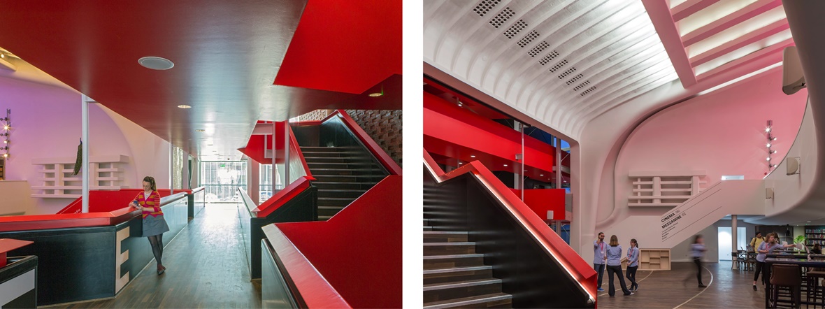 Internally, the new entrance leads into a glazed slot of space under the vivid red steel structure of the main stair and circulation gantries linking the different theatre levels. Its language of exposed steel and painted ply is one that Bennetts employs robustly and straightforwardly throughout the scheme.