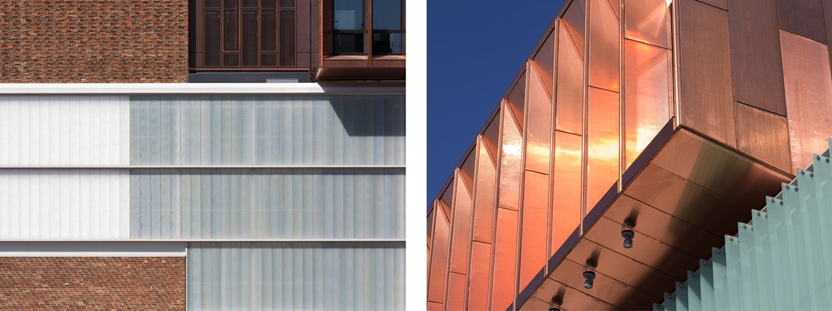 The extension containing the theatre and studio is conceived as a companion piece to the Odeon. The main auditorium and flytower volume which form the armature of the extension are clad in brick. Steel-framed audience circulation walkways flank the brick auditorium enclosed by glazed cladding. The main theatre itself is designed to operate as an 800-seat theatre with a programme of touring productions for some of the year, but is reconfigurable to a 500-seat thrust-stage. The 150-seat studio sits on a series of steel transfer beams and columns which provide acoustic isolation. Clad in copper, it creates a distinct element on the skyline.”