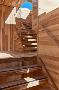 During the day, the eight-metre high American tulipwood installation promises to be fun and playful. The labyrinthine spaces lead visitors through a series of stairs, corridors and open spaces, inviting them to explore the potential of wood in architecture. In the evenings, with subtle lighting, the pavilion becomes a quiet and contemplative space, allowing visitors to reflect on the beauty of its natural material. “The structure will lead people in a joyful dance up and down stairs and crossing bridges, exploring light and space,” says Andrew Waugh.