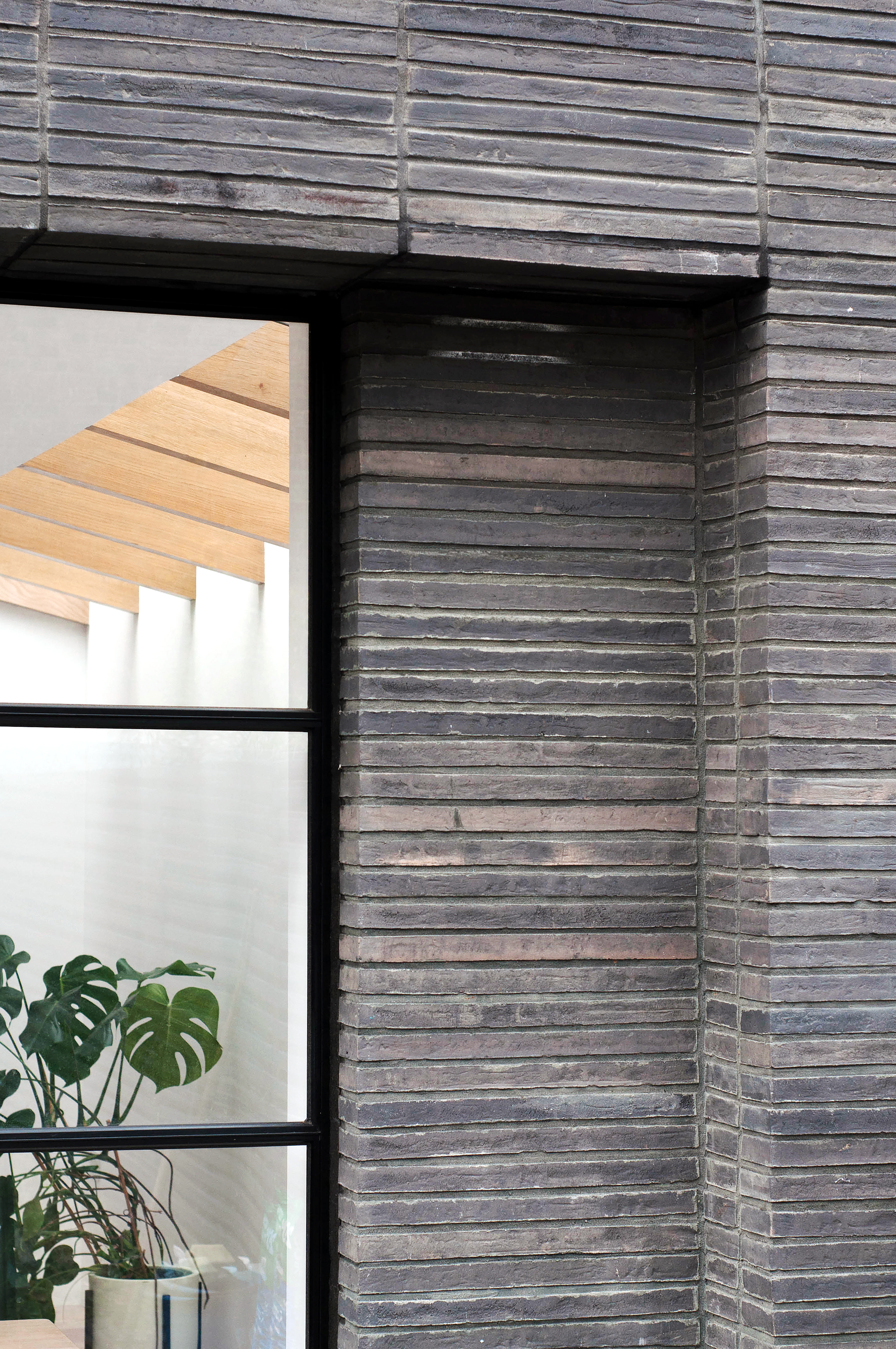Throughout the different levels, the house’s materials harmonize themselves with the existing architecture and harken back to the various aggregates already present. The entirety of the project emphasizes attention to detail and finish, both of which are brought to the forefront through a delicate composition. The rooms are composed of a harmony of textures, where marble, terrazzo, slate, stone, etc. coexist. In contrast to these mineral elements, the teak furniture and brass light fixtures bring warmth to the space. The addition of wood produces a subtle echo which balances the relationship between old and new elements.