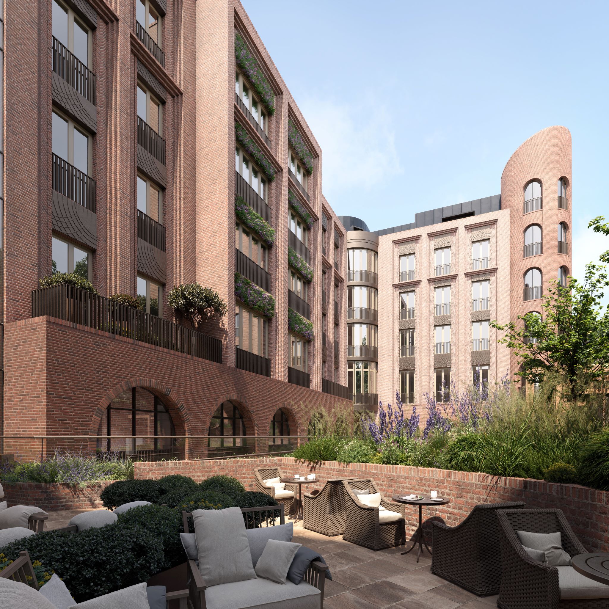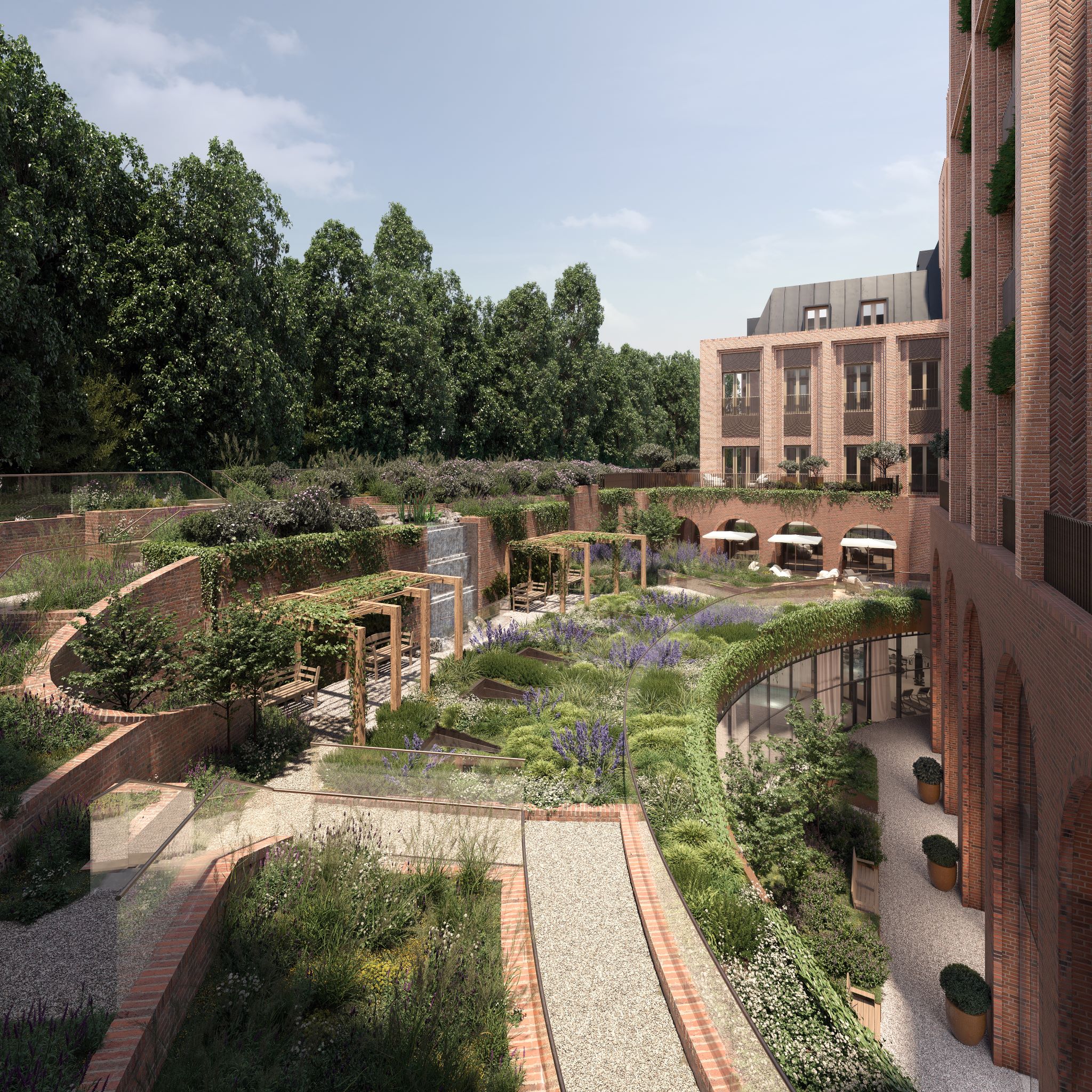 “The rear of the development uses a simplified language which retains the high level of workmanship and crafted details from which the project takes its inspiration. Comprising two distinct elements united with a glazed shadow gap, these share a common material palette encompassing red brick and a bronze metal panel featuring a motif that flows into metalwork balustrades.”