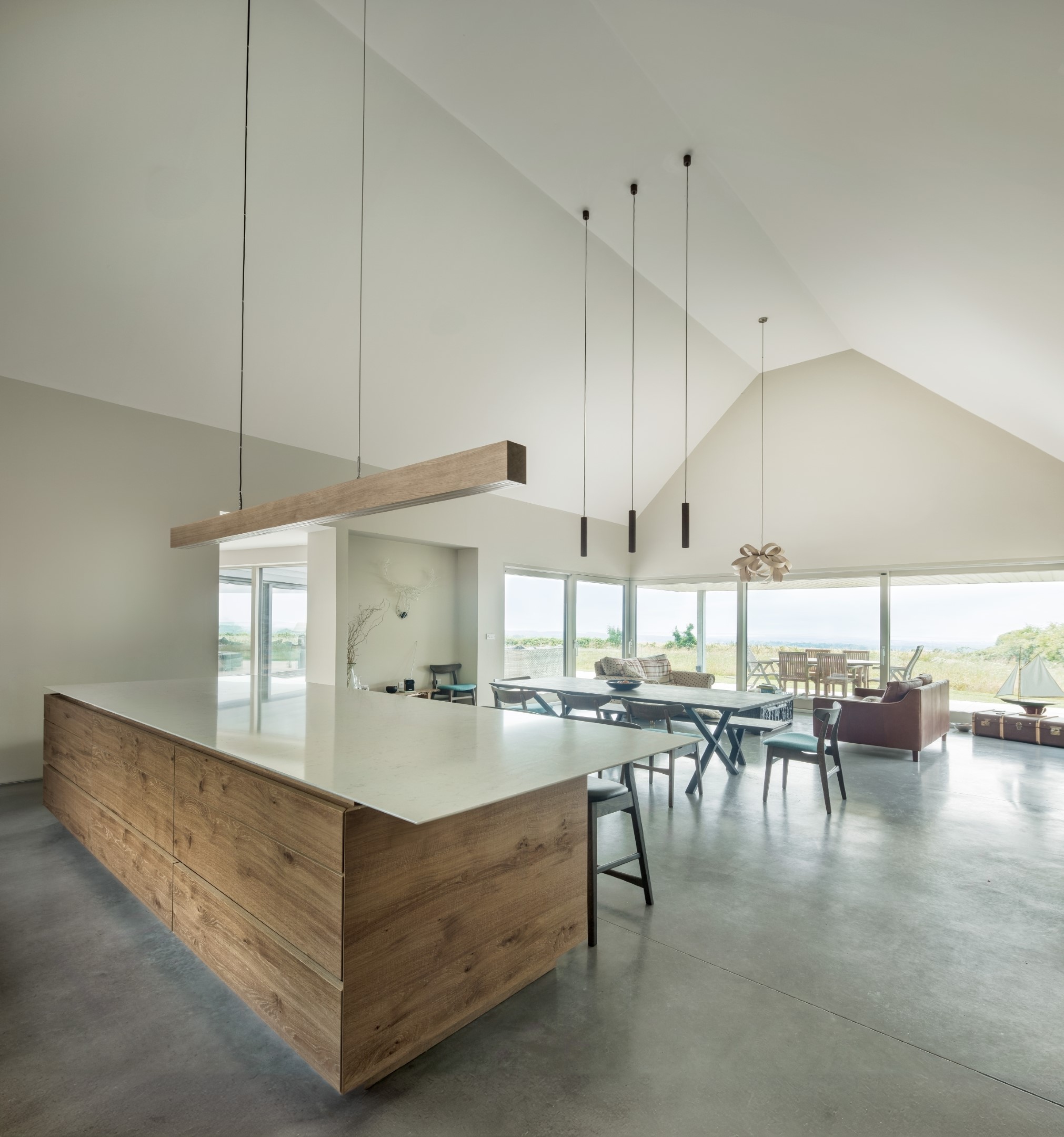 At the heart of the design, the central volumes consist of a two-storey living area with a snug and master bedroom, and a tall, single-storey barn that houses the open-plan kitchen, dining, and living spaces. The entire layout is carefully considered for accessibility, with all key living areas situated on a single level to ensure the property serves as a home for life.