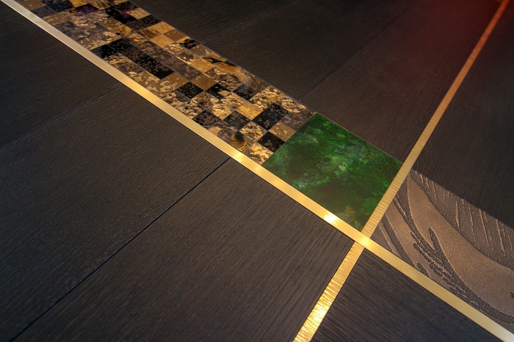Absolutely: We are combining wood flooring with metal inlays and precious resin mosaics – little elements of surprise – while a central wall panel acts as a tapestry showing many different elements and techniques, an artwork in its own right.