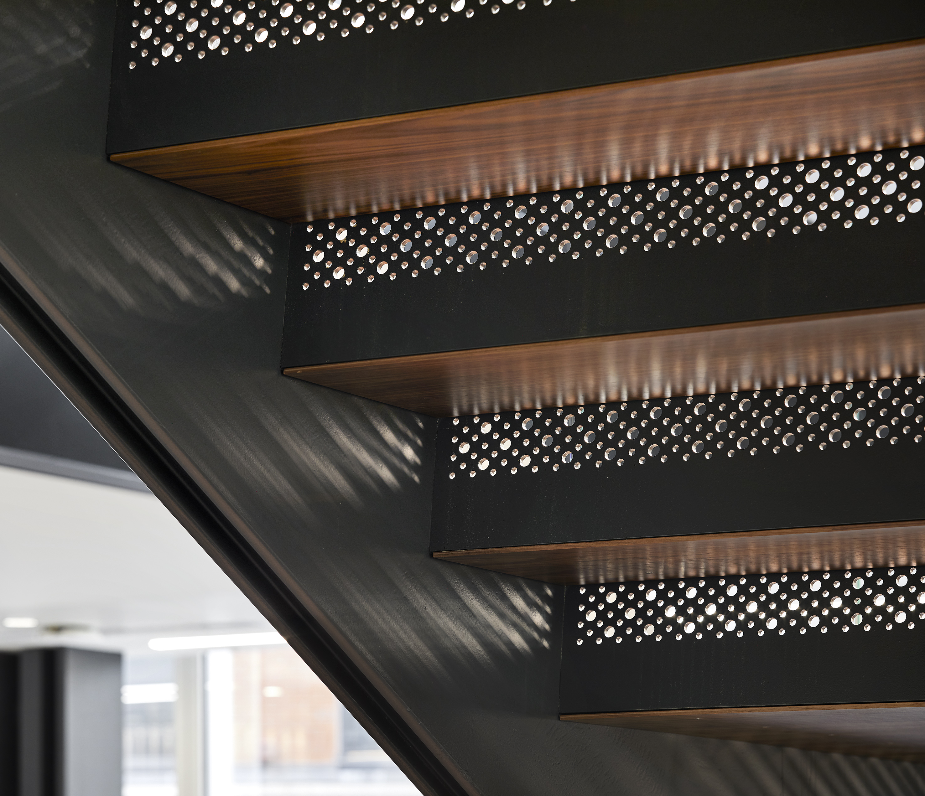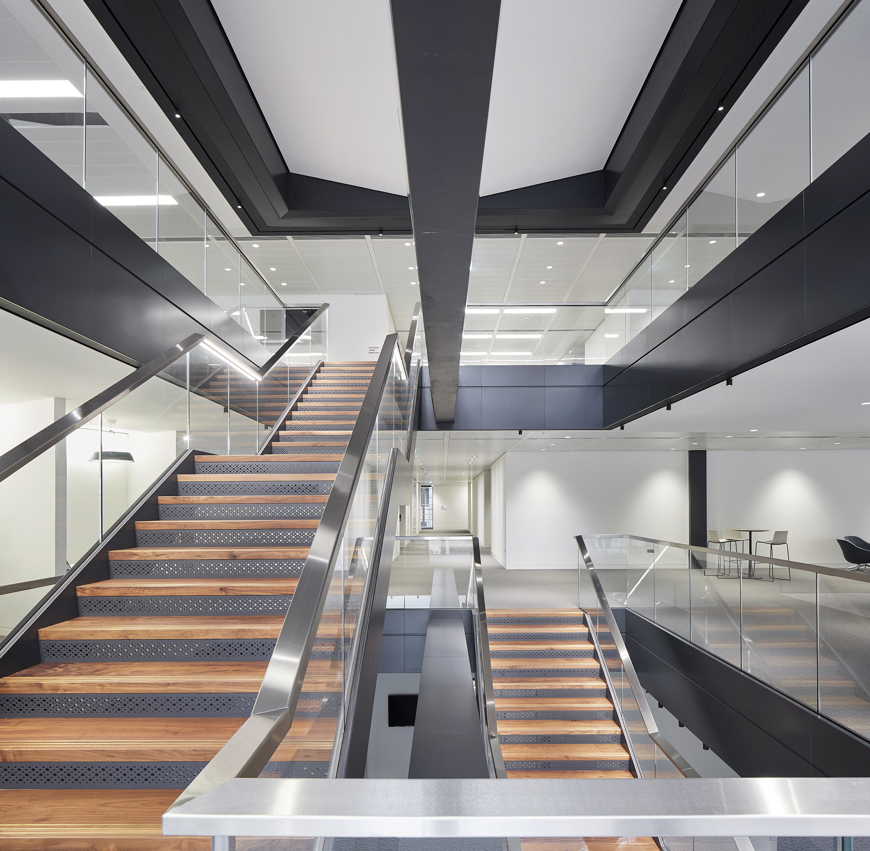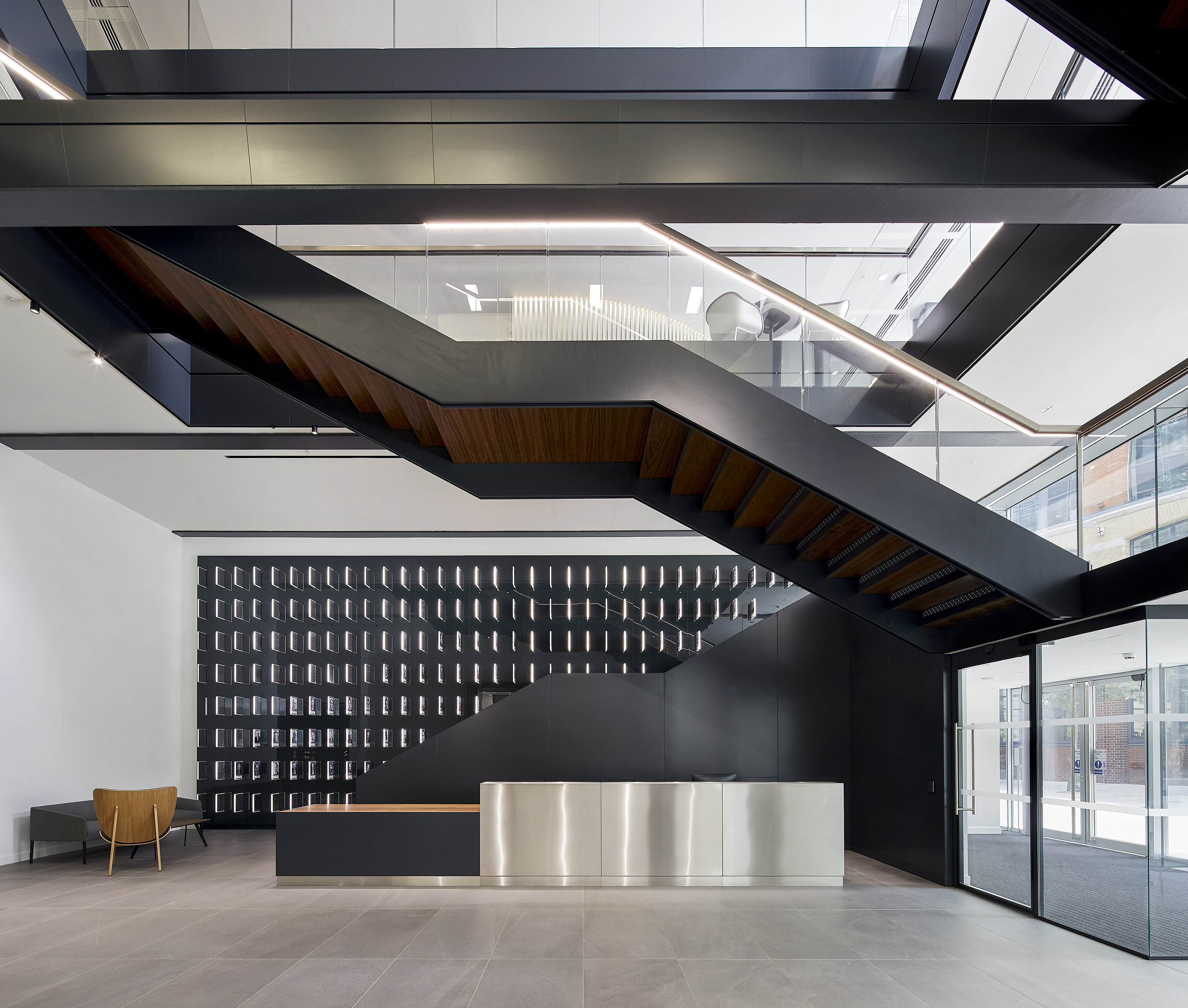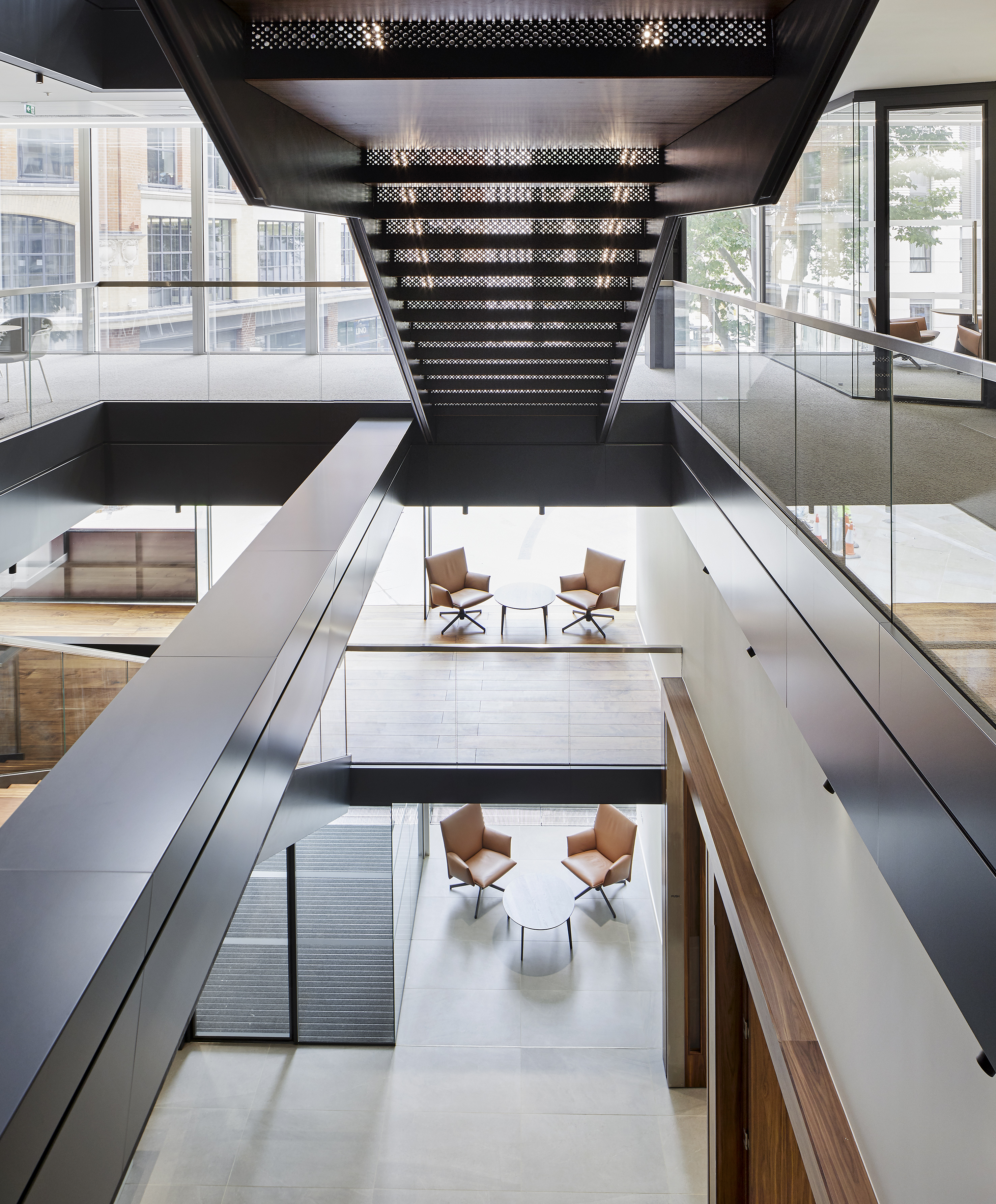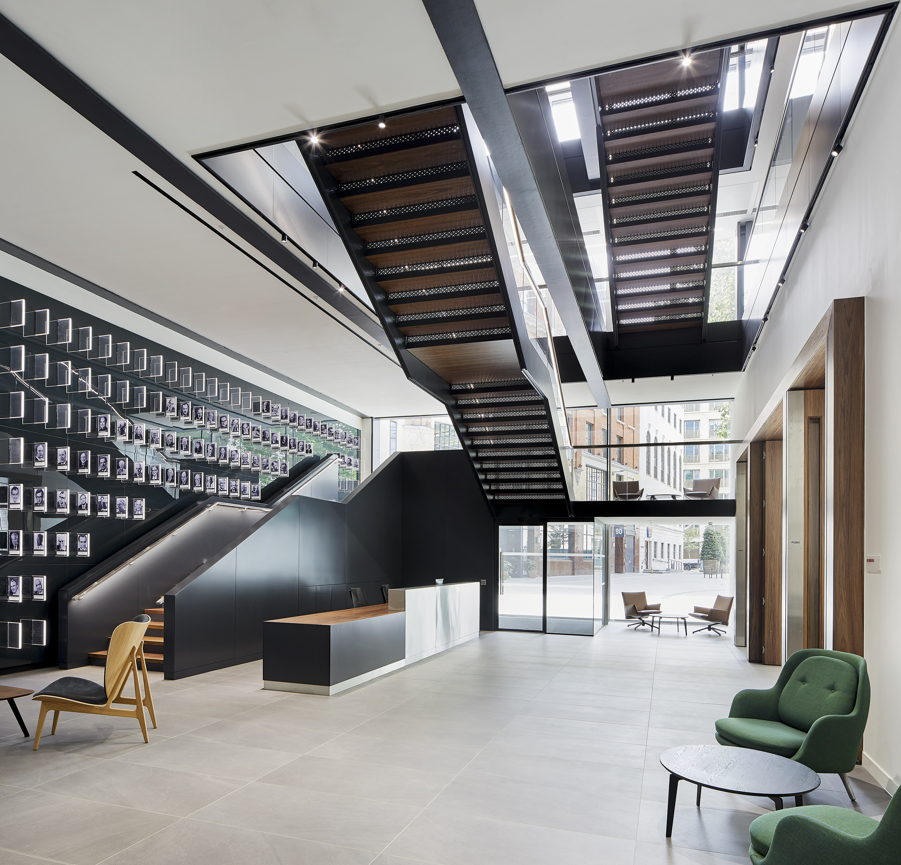 In their design of the Chicago Booth London campus, astudio prioritised access to natural light, creating a new staggered internal staircase that enables light to circulate freely through the three floors. Throughout the building, the design includes a materials palette that combines industrial raw dark grey steel with matte natural oiled walnut as a modern take on the school’s impressive past. At the heart of the building, a feature wall pays homage to the University’s Novel laureates, celebrating its status as a world leading business school.