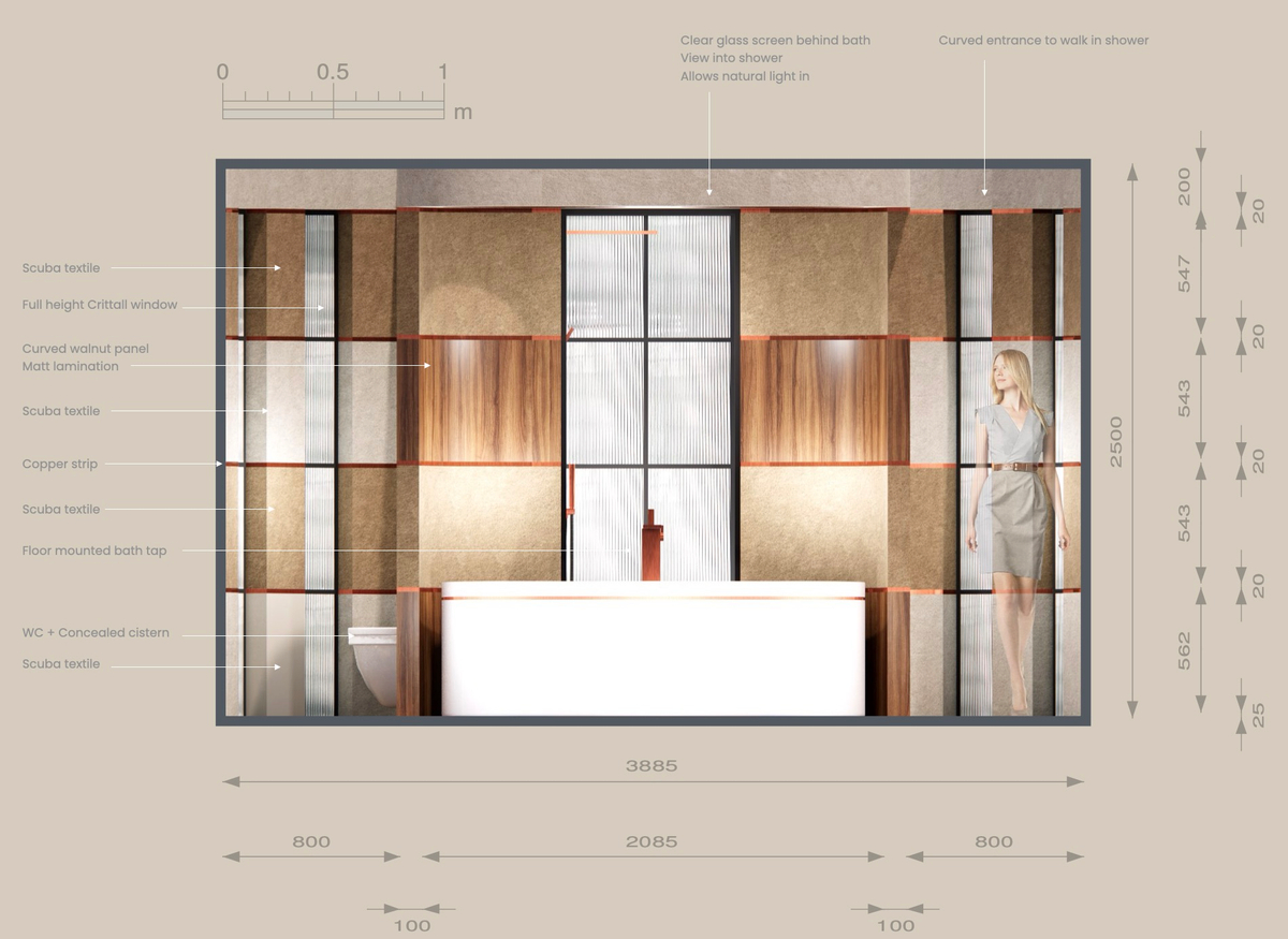 “My inspiration for the bathroom design came from the idea of creating a space that enclosed and protected the client from the outside world. I wanted to develop an inner space that wrapped around them in a warm embrace and where they could relax and be themselves.”