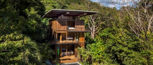 Costa Rica Treehouse is inspired by the jungle of this densely forested site on the Pacific Coast of Costa Rica. Built entirely of teak wood harvested on-site, the retreat engages with the jungle at each of its three levels: at the forest floor, the middle floor is nestled within the trees, and the top level rises above the tree canopy with views of the surf at nearby Playa Hermosa beach.