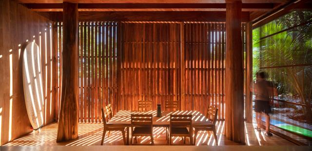 Designed to operate passively, the home is intended to breathe and remain open to the elements in this temperate semi-tropic environment. The top and bottom floors are completely open to the elements with a double-screen operable wood shutter system, allowing daylight and natural ventilation, but also privacy and security when the owners are away. Shading, a 3.5-kW photovoltaic array, and a rainwater collection system make the house’s compact footprint even lighter on the land.