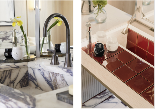 The collection is defined by the fusion of rich textures and a color palette I’ve called Deeply Chic. Each piece has a function, but at the same time contributes to the overall harmony of the space. One example is the Fior di Viola 4Dmarble, which stands out for its burgundy veining and Plissé effect, adding depth and a sense of luxury reminiscent of the most exclusive fabrics. It’s a play of contrast between delicacy and precision, achieving the perfect balance.