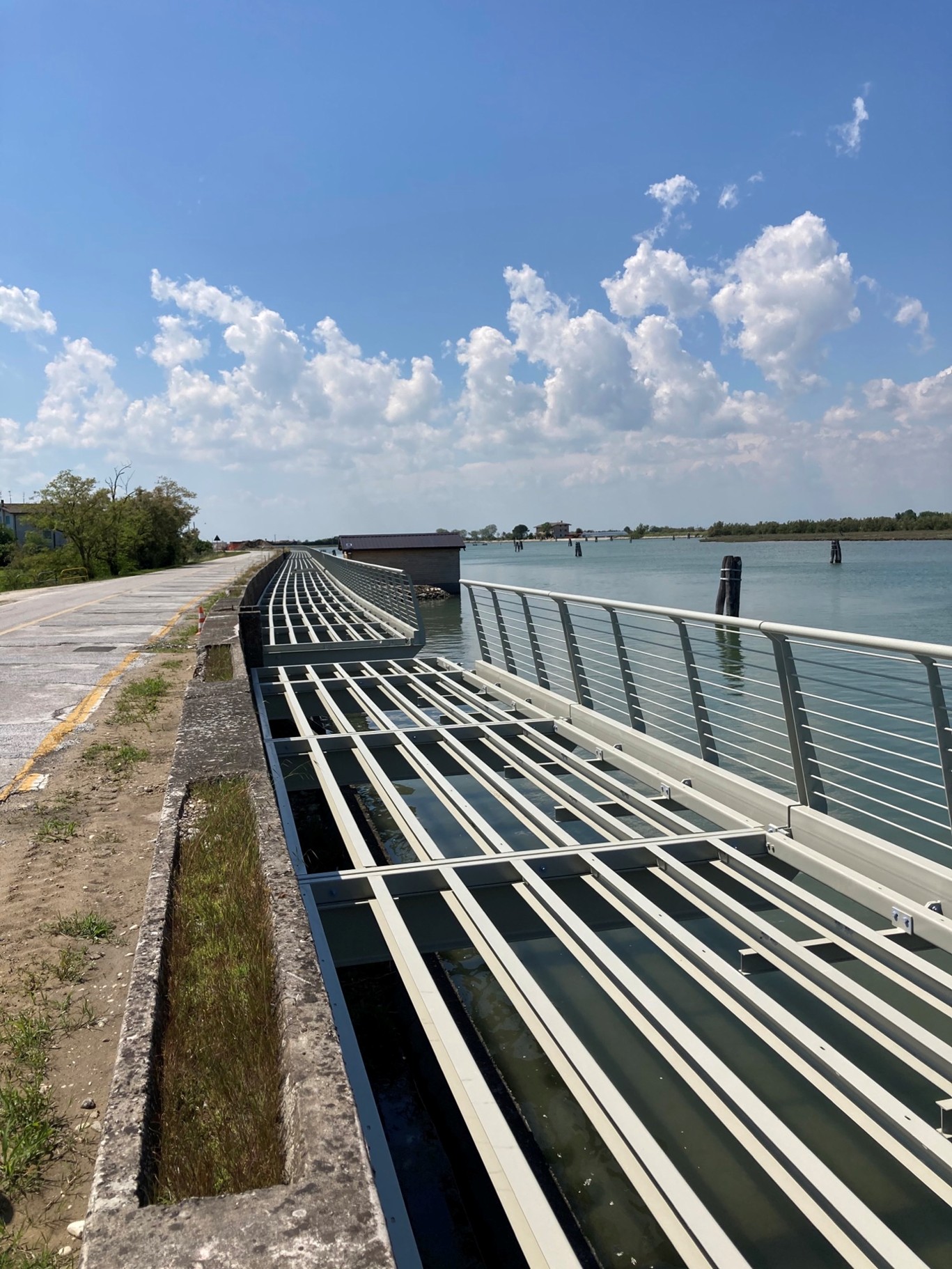 Seamless integration into the lagoon landscape: With the elevated cycling and pedestrian path La Via del Respiro, one of the most iconic and innovative infrastructures along the Venetian coast was created. The image shows the construction site. Today, the path is considered one of the most spectacular in Europe, skillfully combining nature and technology within the sensitive lagoon environment.