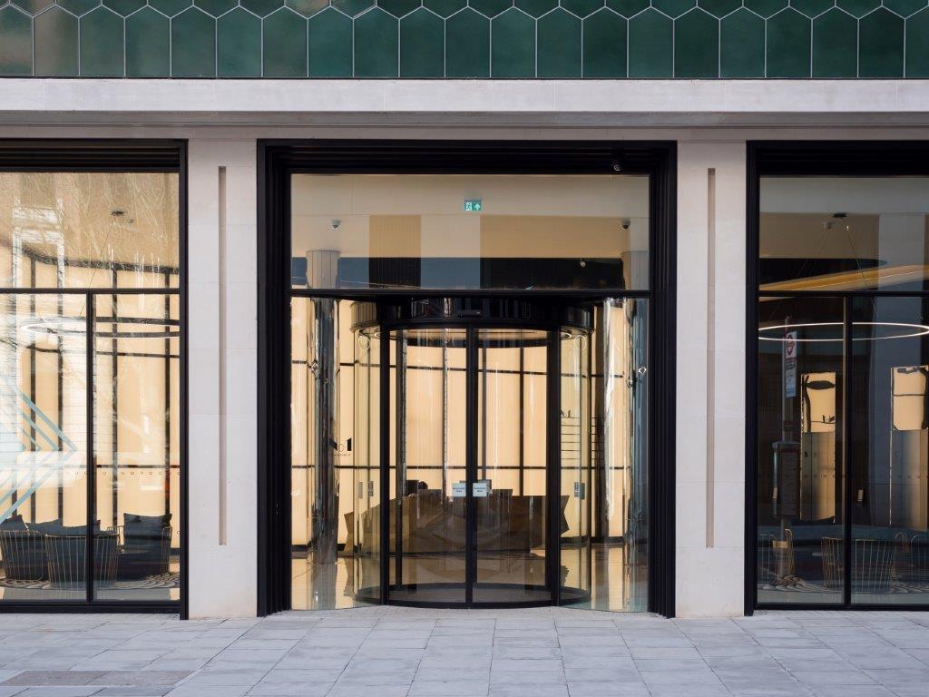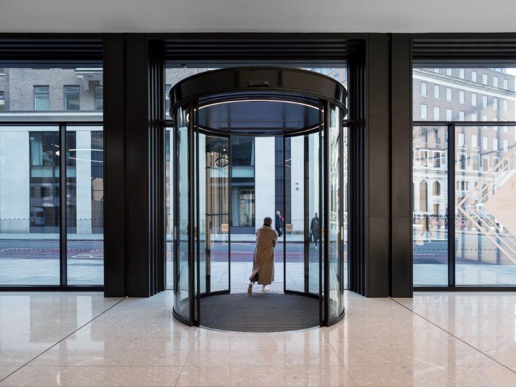 The automatic circular sliding doors from GEZE UK make quite a statement, providing an entrance which blends seamlessly into the curved and streamlined contours of a building which stands proud, like the prow of a ship, on a site where New Oxford Street and High Holborn meet at an acute angle.