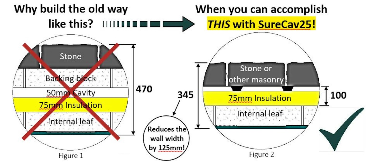 Figure 2 demonstrates that by removing the block backing wall and instead, using SureCav25 as the cavity spacer and backing system, the wall thickness is reduced by 125mm – a significant space saving, either allowing more internal room space or reducing the overall footprint of the dwelling. This then becomes the ideal solution in achieving a U-Value as low as 0.17W/m2K using a 75mm wide insulation board in conjunction with SureCav25 forming the 25mm clear residual cavity. Add more insulation and lower the