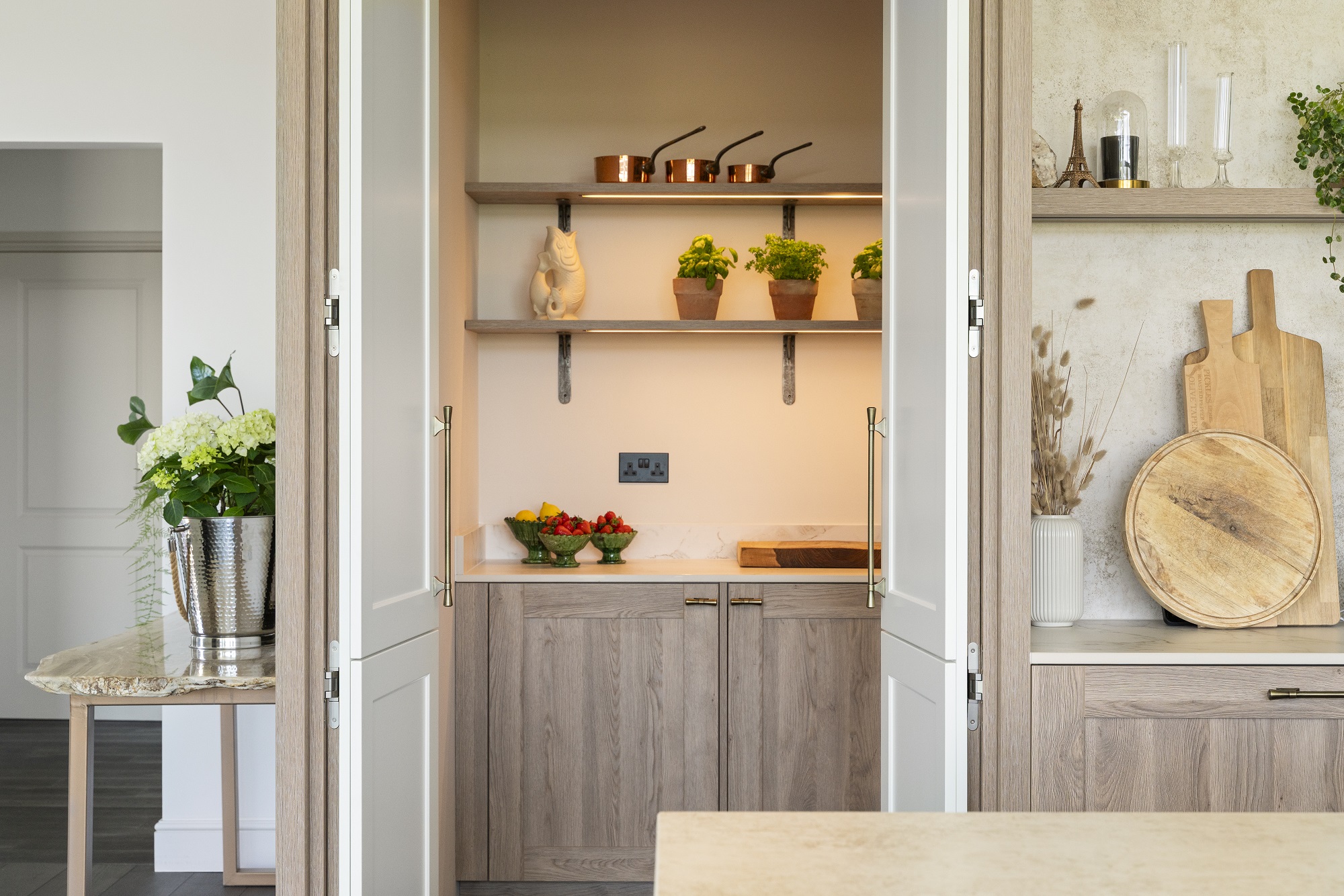 Contemporary Rotpunkt Ergo LX furniture in Matt White Lacquer is used across the tall cabinets, pantry doors and island drawers, with Tempo SY furniture in Bardolia Real Oak on the base units, end panels and shelving in the kitchen and secret walk-in pantry. The hidden walk-in pantry features the innovative access doors also by Rotpunkt, which open in reverse and can be designed in the same style and finish as the main kitchen interior. When in use, the illusive Ergo pantry doors open to reveal a galley style walk-in pantry so the homeowner can easily store food, kitchen supplies, and other household items away from the kitchen living space.