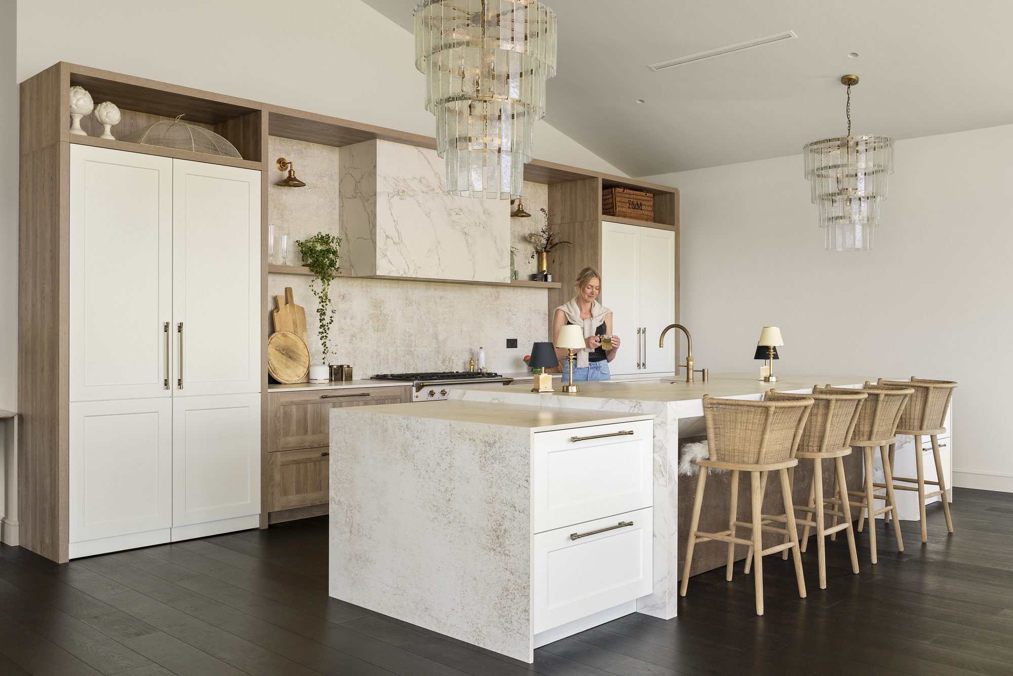 Helping to realise the overall colour palette and natural flow of the space, both homeowner and founder of Willow Home Design, Jade Glynn explains, “Having partnered with the exceptional team at Et Lorem on numerous residential projects, I knew their creative expertise would be invaluable when it came time to reimagining my own home. Interestingly, I took lots of inspiration from American-style kitchens due to the scale of my room matching their statelier style of interior design. A room of this scale can feel quite overwhelming, especially with a vaulted ceiling, so I did wonder how I would fill the space and be able to retain a homely feel. The result is a kitchen-living space that embodies ergonomic design, timeless style, and a tailored approach — a space that reflects my personal aesthetic while enhancing the way I live each day.”