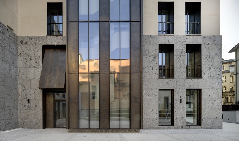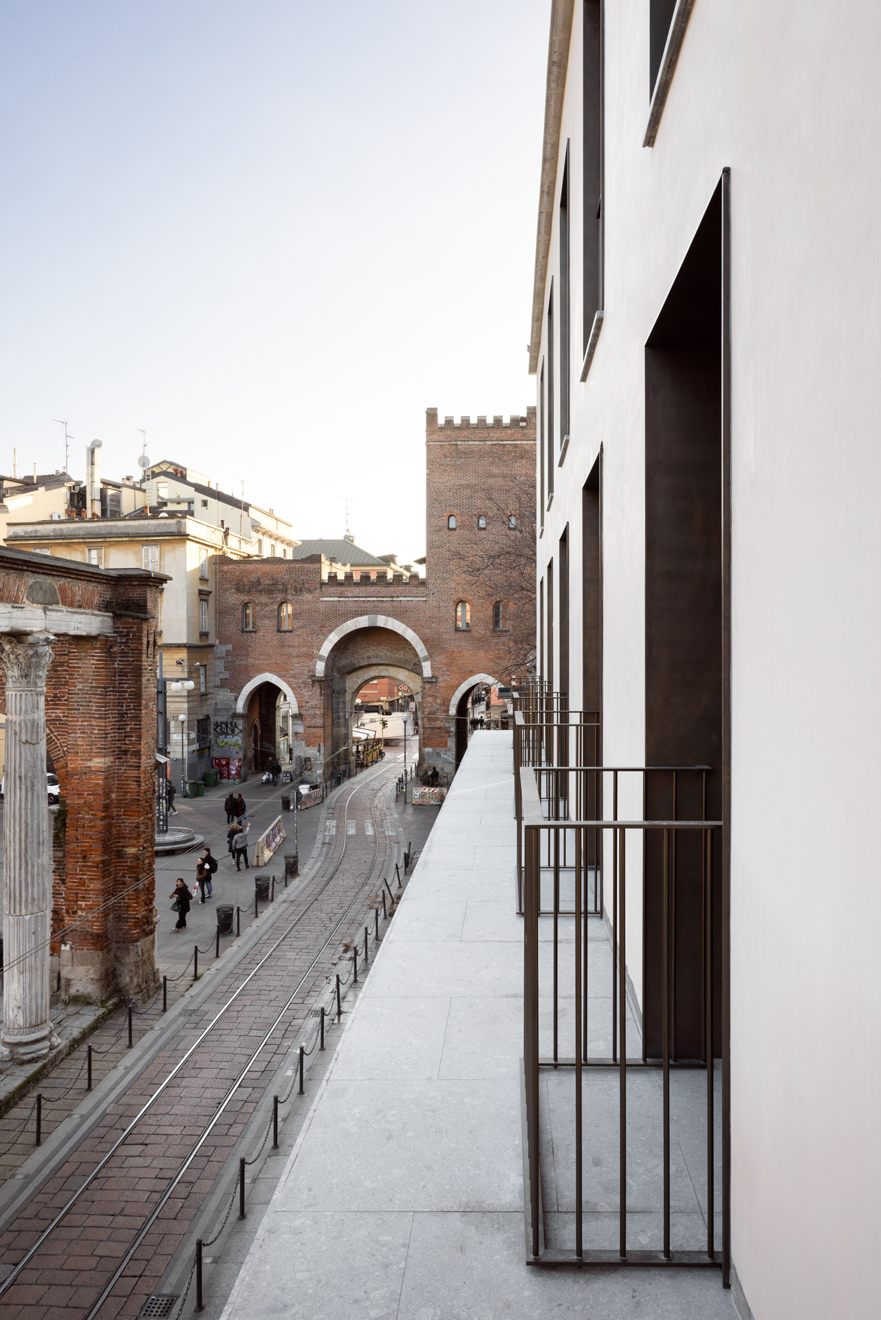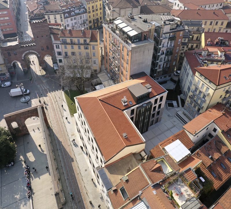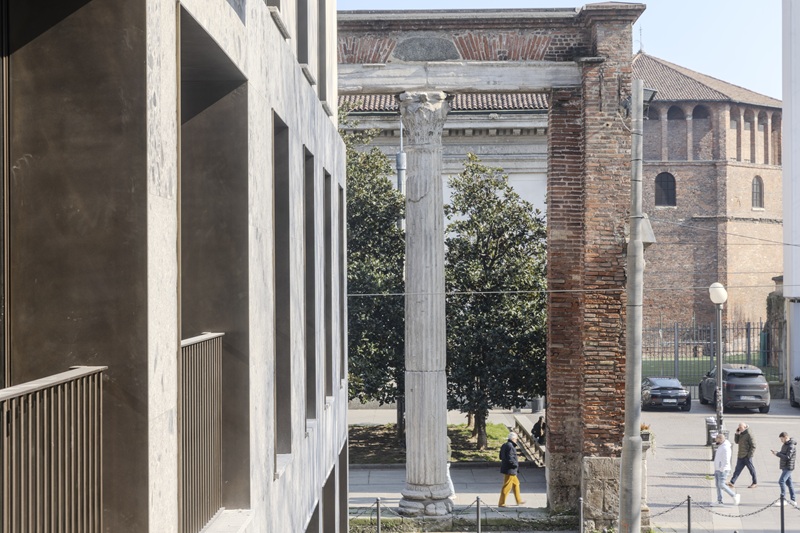 The decision to complete the facade sequence of the building block facing the columns of San Lorenzo, along with the careful selection of façade materials and external paving, gives the intervention a balanced appearance in line with Milanese tradition.