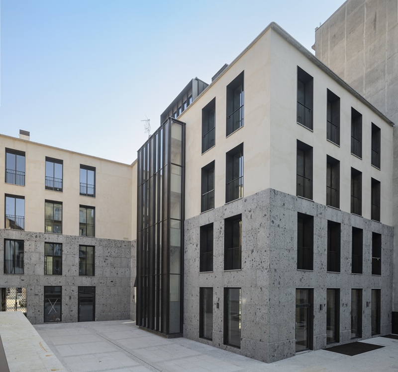 “The internal courtyard takes on an urban role as a space of connection between the surrounding buildings, proposing a reorganization of the neighborhood’s pedestrian circulation. This public space restores the incomplete frontage that has remained for decades and, thanks to seating and greenery, becomes a new meeting place for the community.”