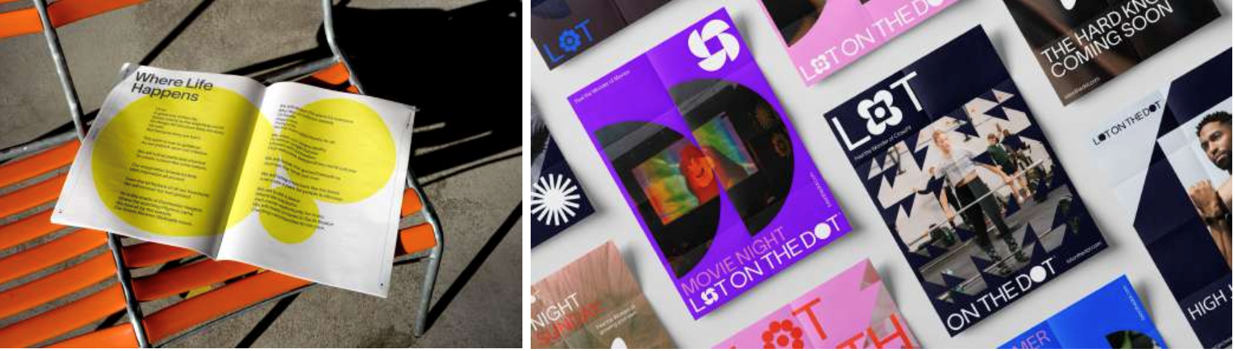 •Designed as a playful sub-brand of On the Dot, The LOT’s identity features a mix of bold, geometric forms, always integrating a circle to tie back to the parent brand.