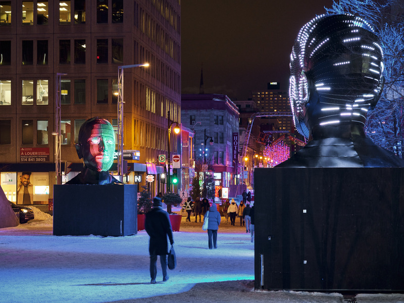 The public will enjoy an impressive set of outdoor installations all winter. Posted on Sainte-Catherine and St-Urbain Streets, Talking Heads by Limelight Art (Hungary), is already the talk of the town, with its two heads made up of 4,000 light-emitting diodes that interact with each other to produce facial expressions in different colors and conduct real conversations through light.