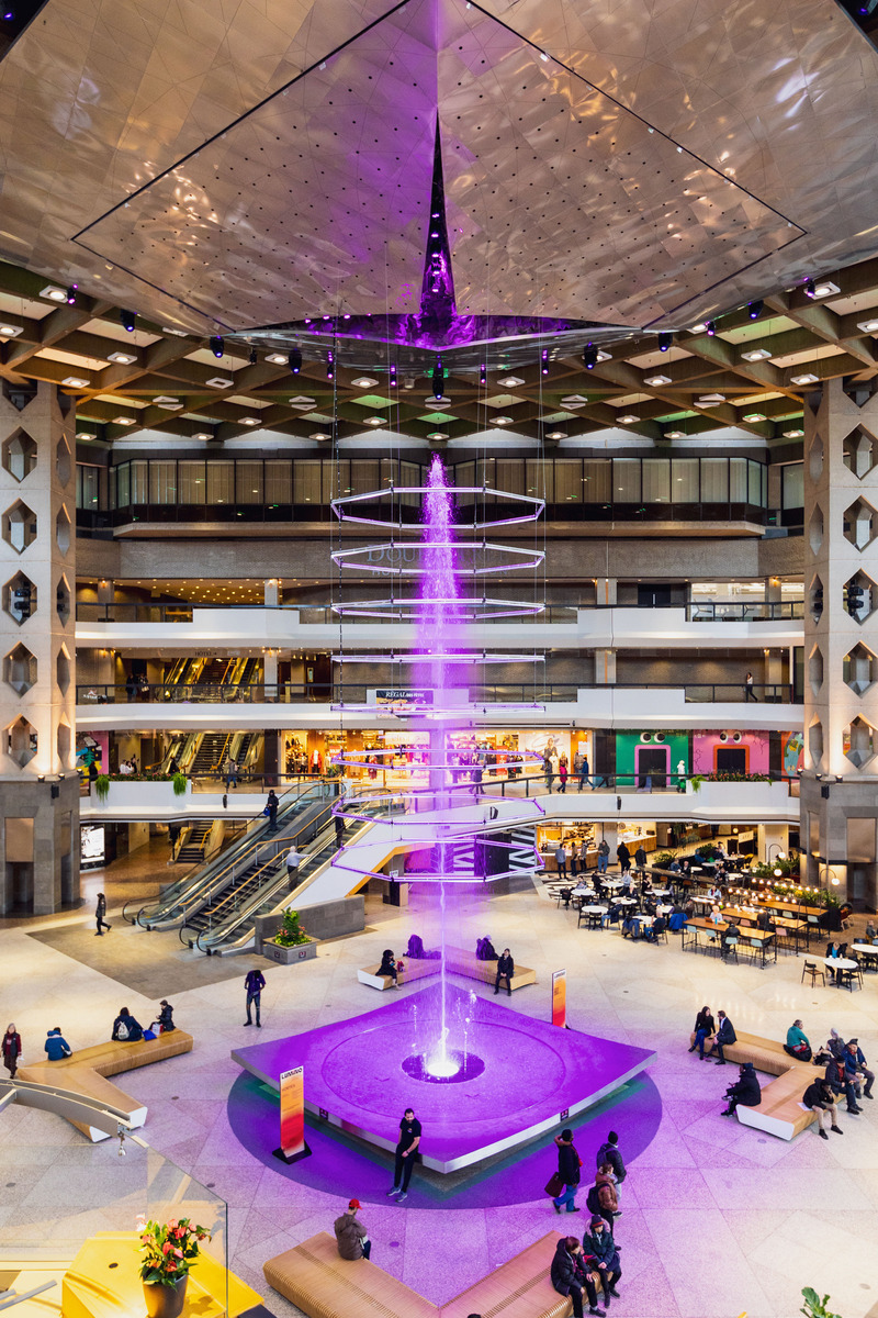 With VORTEX, artist Nicolas Paolozzi stages an encounter between light, water and geometry. Positioned above the Complexe Desjardins fountain, this immersive work provides a poetic sensory experience. Meanwhile, an interactive work called Cinétique, by Ottomata, is located inside The Fairmont The Queen Elizabeth. Its dozens of luminous stems, arranged in a circle, invite the public to explore the invisible kinetic forces that surround us and shape our everyday lives.