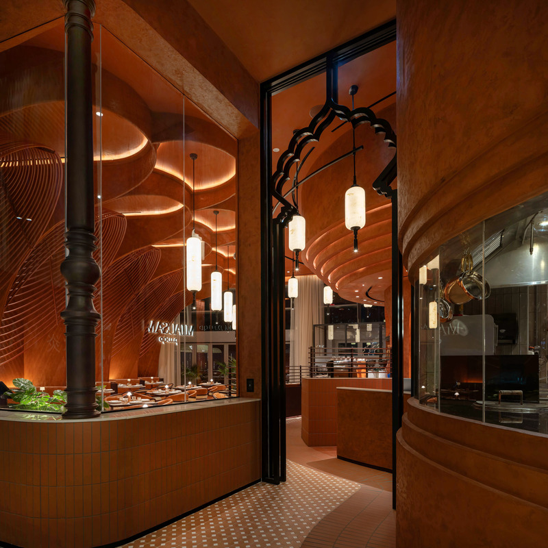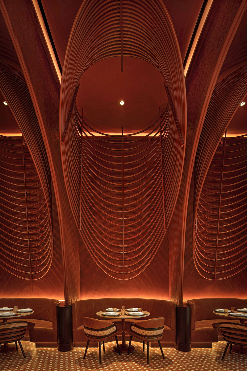 Beyond their visual impact, the rings also serve a functional purpose by subtly dividing the expansive restaurant into intimate dining zones, guiding guests through the space while maintaining a sense of openness.