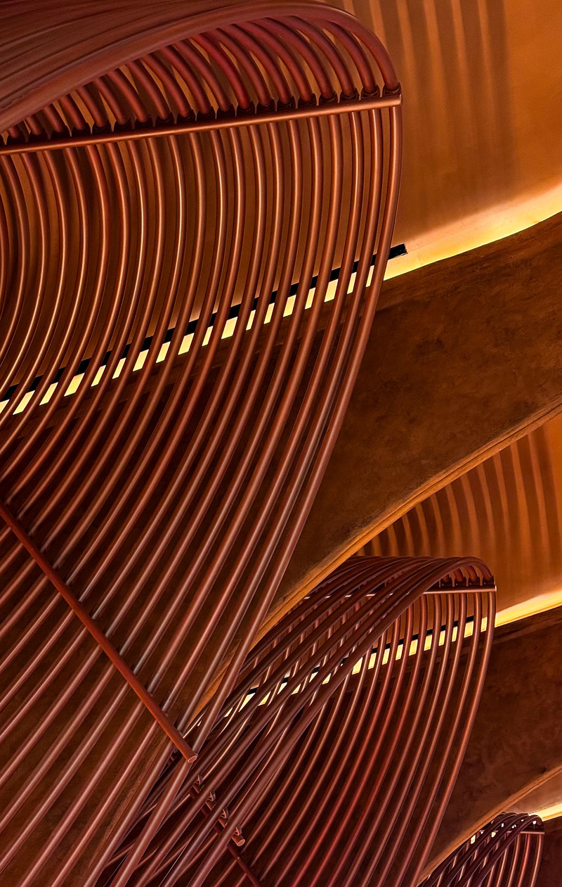 The curved metal rings, rising from the floor to the ceiling, are crafted from precision-engineered materials, their soft metallic finish and terracotta-hued patina evoking the warmth of Indian sandstone. The undulating forms create a dynamic spatial experience, offering a sense of depth and rhythm.