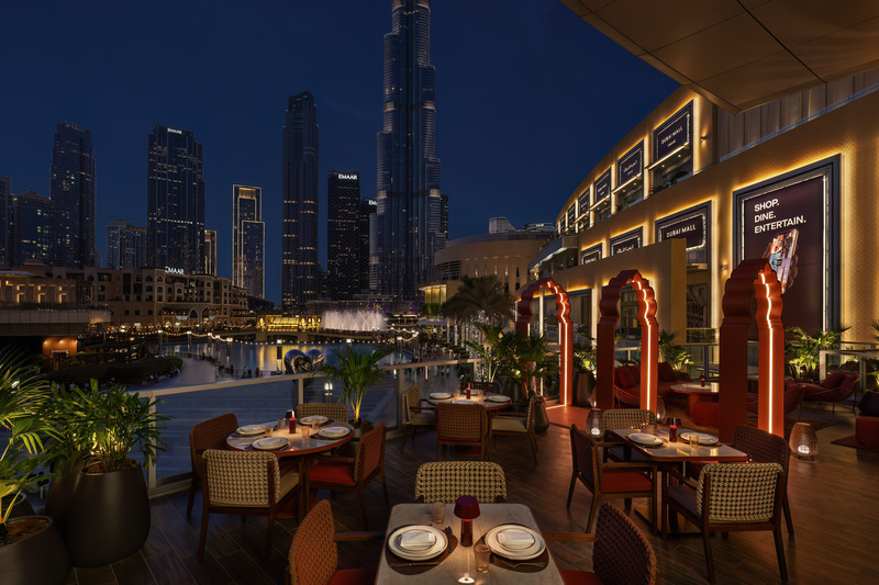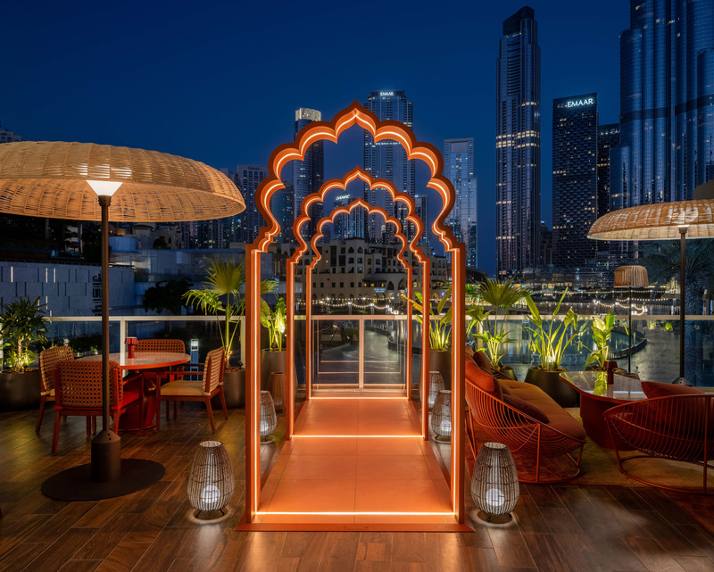 Mausam’s outdoor terrace offers a contemplative counterpoint to the opulence of the interior. The panoramic views of the Burj Khalifa and the Dubai Fountain provide a dramatic backdrop, while a grand illuminated archway frames these views, creating a visual dialogue between the restaurant’s design and the iconic Dubai skyline.
