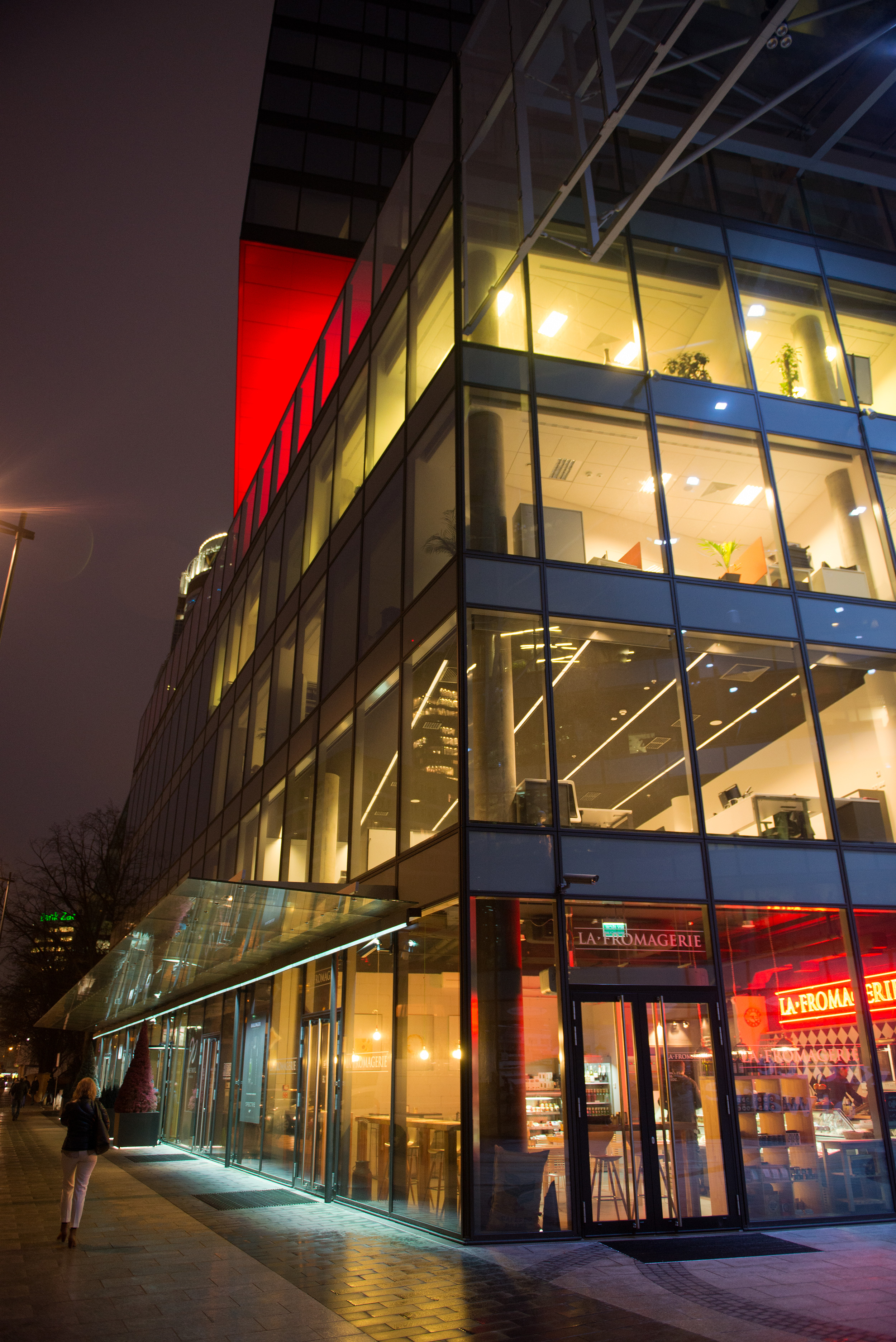 The tower was designed by architect Helmut Jahn, and developed by Tacit Investment. “To me, urban space is essential to architecture. All my buildings respond to the existing urban space, while creating it with their arrangement and rhythm” says Helmut Jahn. As part of his design, the tower has a red ceiling above level 4, this ceiling lighting provided a focal point on the main building within the landscape which is further enhanced by the linear sidewalk lighting and atrium lighting. The combined effect provides a key visual element from street level for residents enjoying the recreation area.