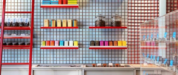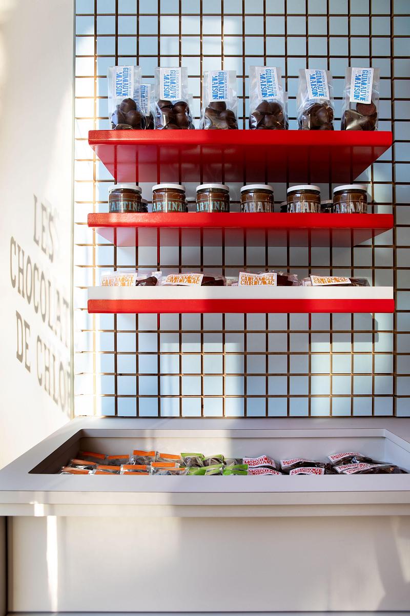 Enrobing is the process of coating ganaches with a thin layer of chocolate that protects, softens, and enhances the piece. The subtle exterior of the main counter and the neutral display units are contrasted with vibrant interior colors, evoking the meticulous precision of chocolate enrobing, reinforcing the sensory dimension of the space. The square pattern and red accents create visual coherence, thus affirming a warm yet playful identity.
