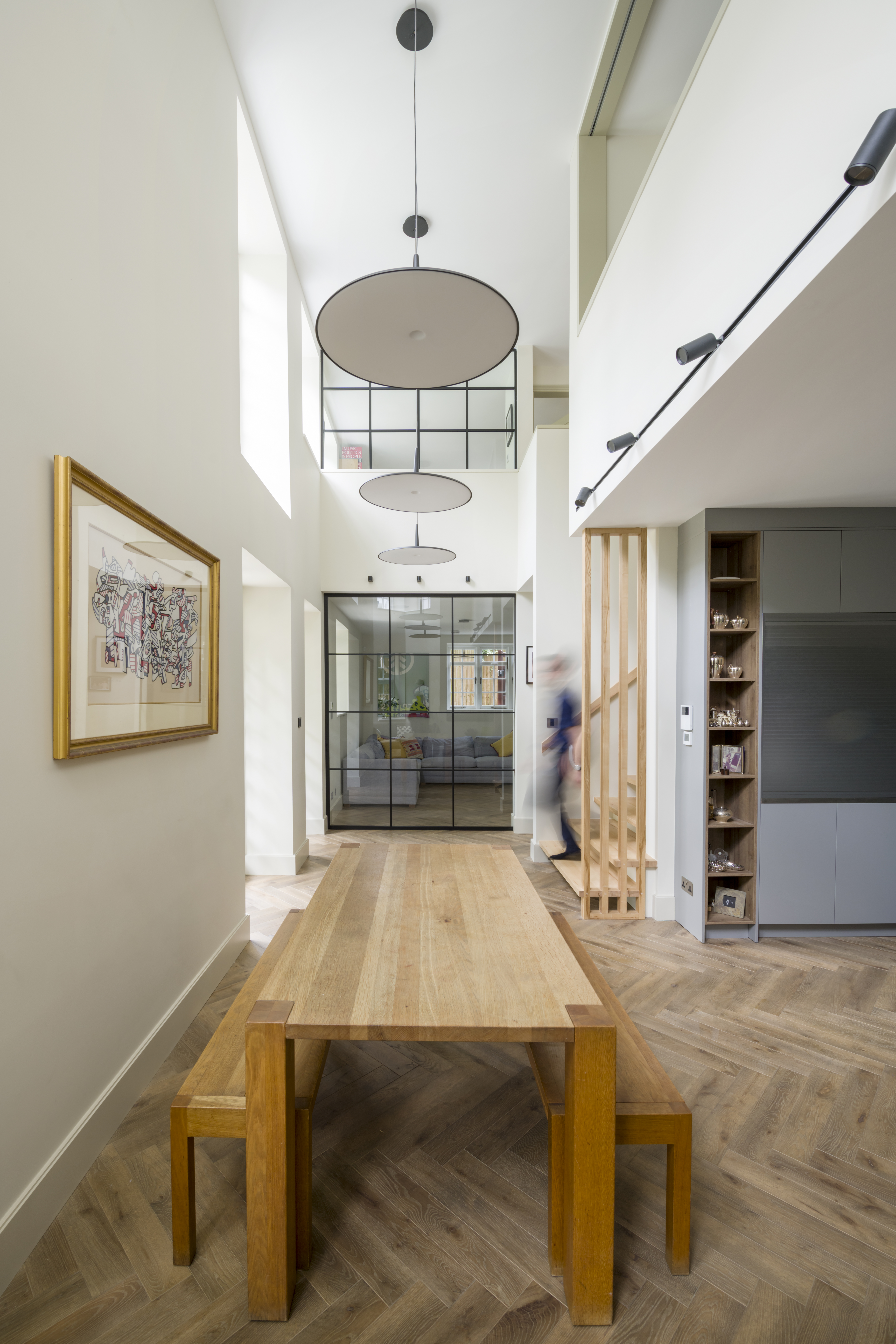 “We wanted to encourage the use of the lower ground floor and reconfigured the home to create more space downstairs,” says Hirschfield. The kitchen and dining area have both been relocated into one open-plan space, which sits alongside the snug TV room located below the new study. Better connections are afforded between the floors through the use of internal glazed partitions.