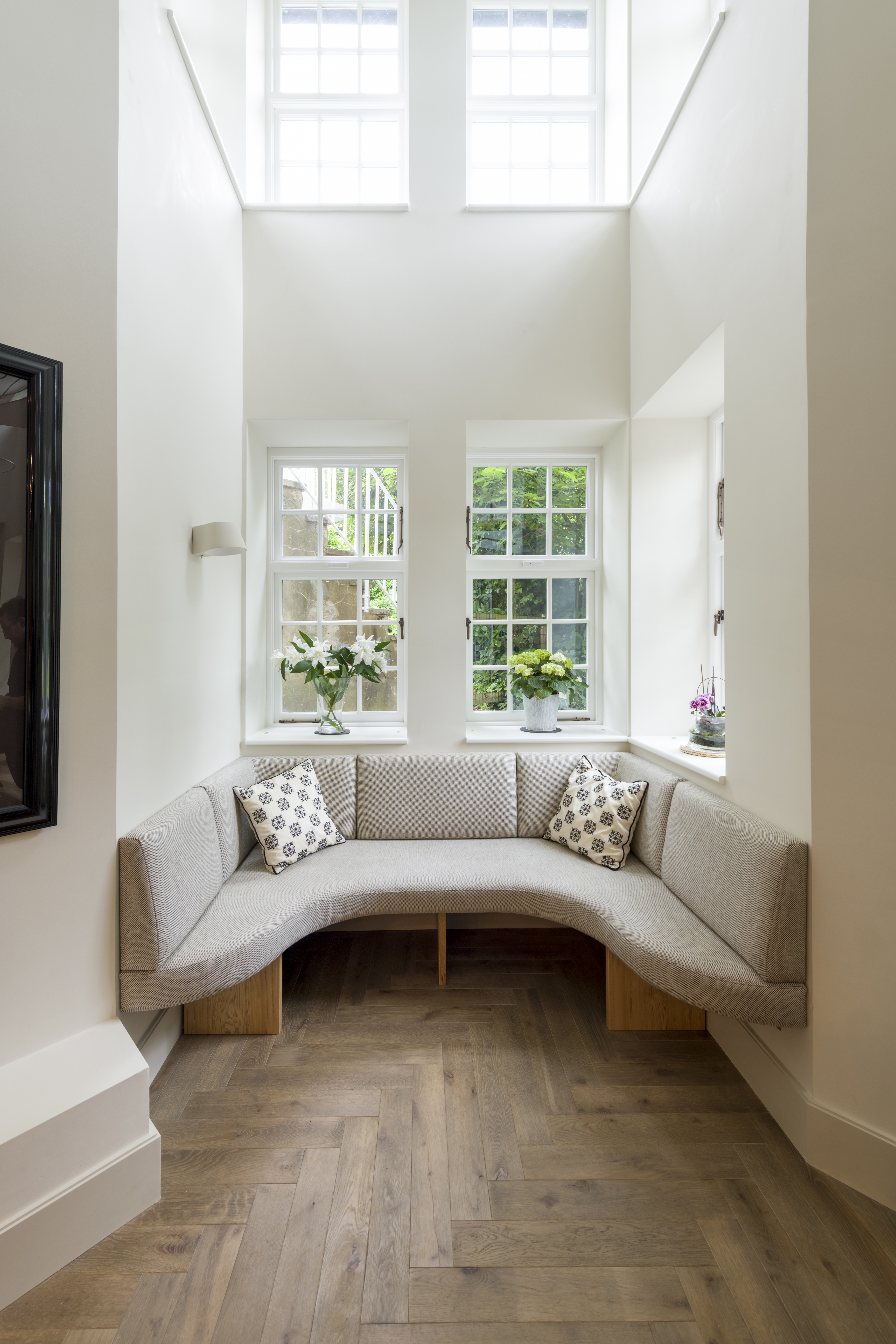 The large, diagonal bay window was an original feature of the building that had previously looked down the centre of the garden, until a neighbouring house was built in close proximity. “We restored the majesty of this architectural feature by pulling back the ground floor at this point,” says Hirschfield, “creating a double-height window. Those enjoying this feature at lower ground level are enveloped by the banquette, with a backdrop of greenery seen through the windows.” The view from the ground floor is now far-reaching across the garden’s woodland and tree canopy.