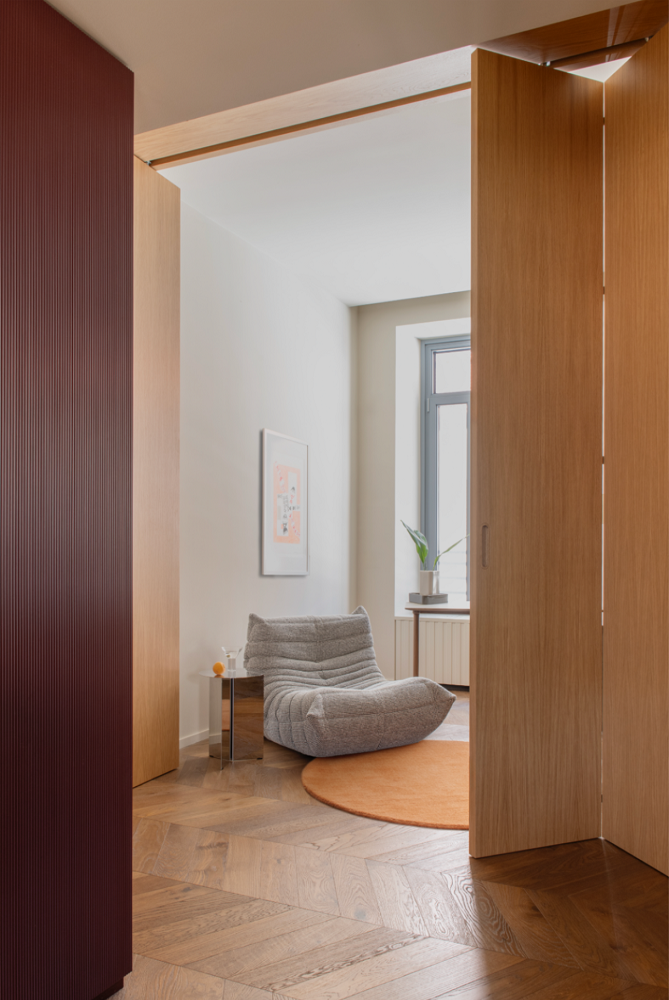 The apartment, designed by Kick.Office, is part of a broader restoration project that enhances the building’s identity while respecting its original structure. Mo.1950 embraced this context by creating bespoke furnishings tailored to the studio’s language—an approach defined by a refined study of colors, surfaces, and materials, often explored through unexpected combinations.