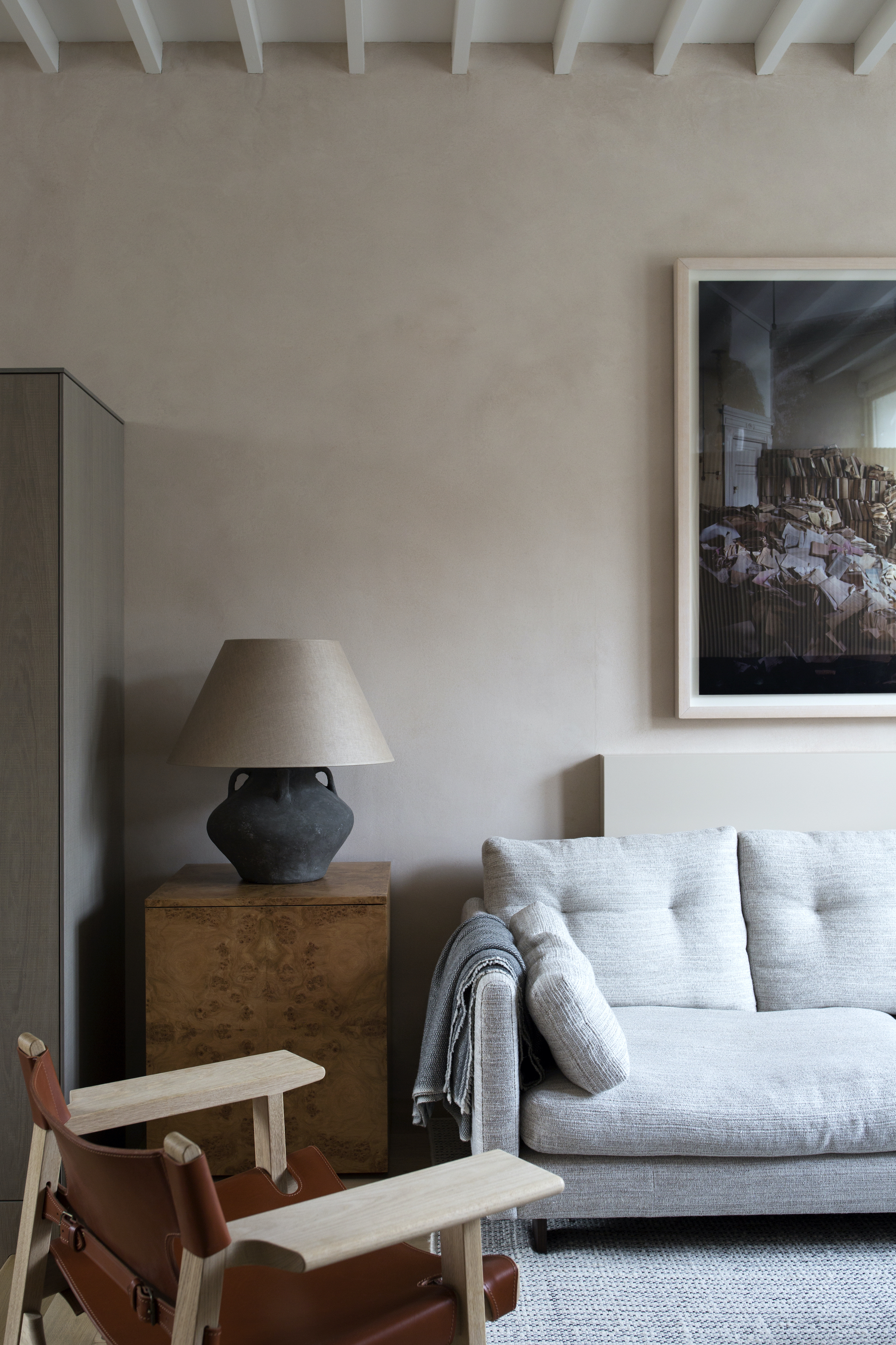 A tonal palette of chalky, earthy hues are employed throughout the property. In the main living space, a mix of fluted joinery, mid-century furniture pieces, natural materials, textiles and rustic accessories create a texturally rich environment. Original large sash windows add a complimentary sense of tradition to the modern feel of the open plan floor. The bespoke kitchen crafted is a contemporary delight, crafted from cross sawn oak veneer, marble and touches of satin brass, it effortlessly evokes an understated luxury.