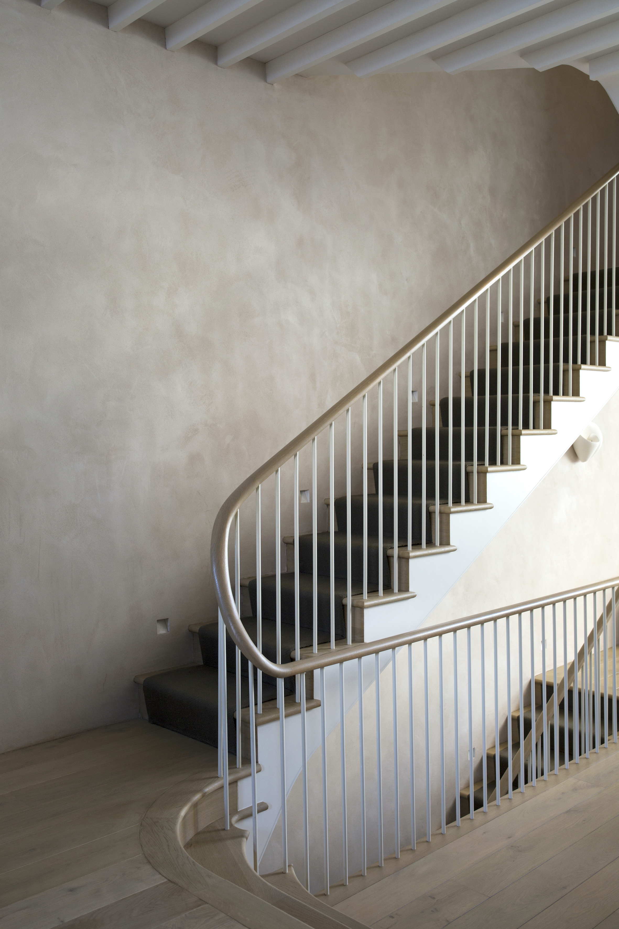 TR Studio explored textured clay walls for the first time in all key rooms alongside the main stairwell to help connect the spaces vertically. Oak flooring was also chosen for cohesion, whilst a continuous timber handrail playfully runs all through the house uniting each room.