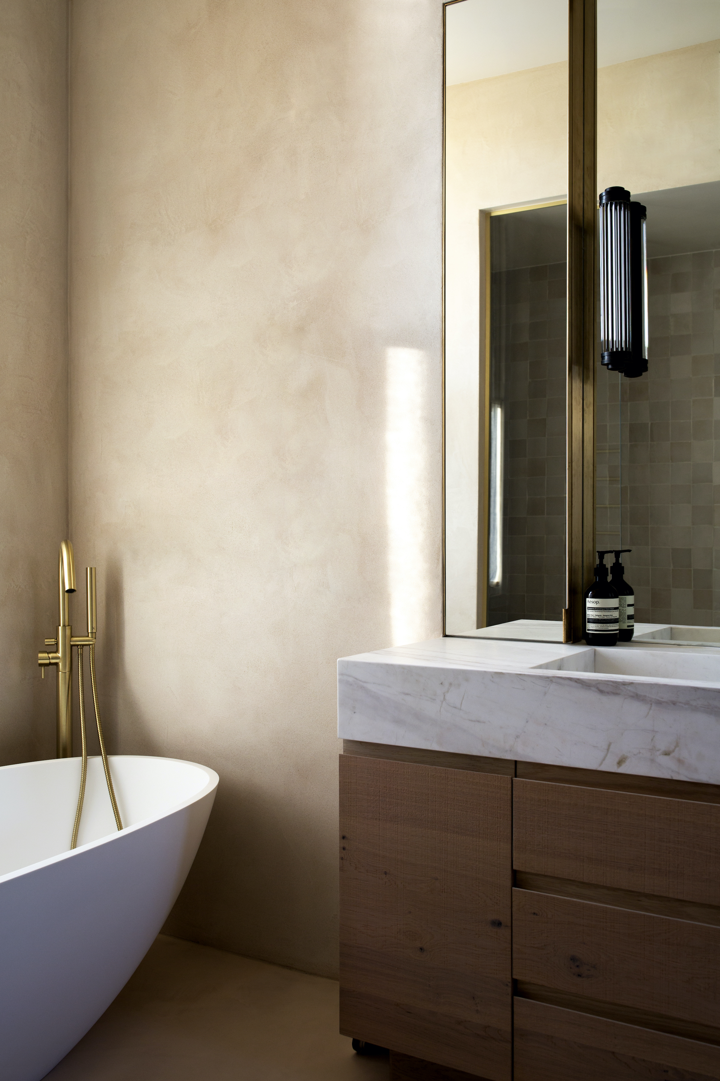 Upper floors house a master bedroom with ensuite, two children’s bedrooms, two guest bedrooms and a family bathroom. Echoing the design details of lower floors, fluted timber, brass and marble create a cosy and relaxed but undeniably chic bathroom complete with a free-standing bath, a Crittall-style glazed shower room door crafted from a variety of textured panels and handmade Moroccan zellige tiles cladding walls with subtle colour and character.