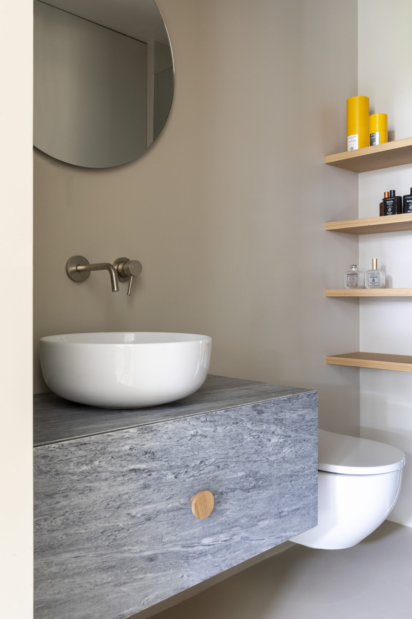 Natural oak wood and grey Bardiglio marble play key roles in this project. What drove your decision to use these materials, and how do they contribute to the sensory experience of the space?