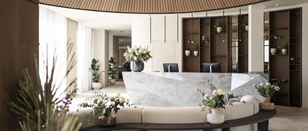 The Noblesse, chosen in the Calacatta Oro nuance, brings classic and timeless elegance to the Family Suite and the Family Chalet. The Gray Marble variant characterises the lobby, where large Slimtech slabs reinterpret the grandeur of marble through a contemporary lens of visual continuity. For the bathroom walls and the floors of the Sauna & Fitness Relaxation Area, a large-format custom solution was developed, which combines durability and a pure aesthetic, reaffirming the brand’s gift for creating bespoke products for any setting.