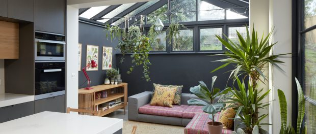 Restoring original features of the property was part of the brief to the architects. Reclaimed wood was used for the flooring within the refurbished living room. The music room or “green room” as the owners refer to it has built-in storage which was already present in the house from a previous renovation. The homeowner enlisted the services of a fabric consultant who chose fabrics for the rooms to add colour and warmth to this vibrant home. The interior design was originally conceived by Philip Lihou from Inner Space London (innerspacelondon.com).